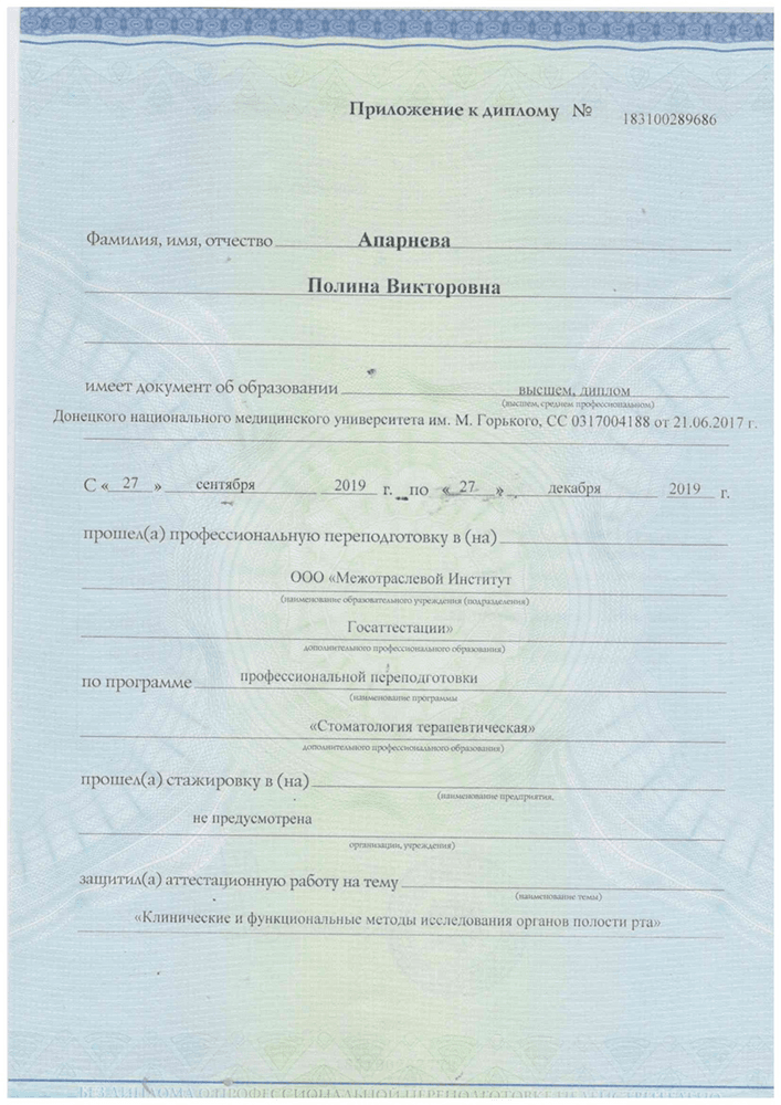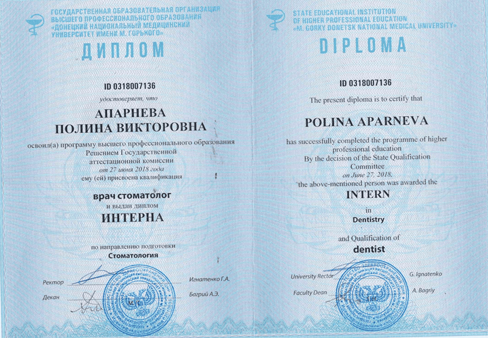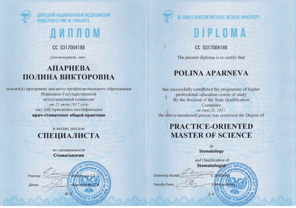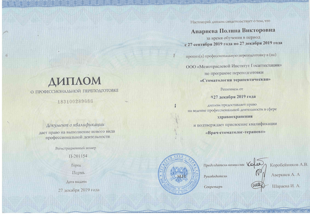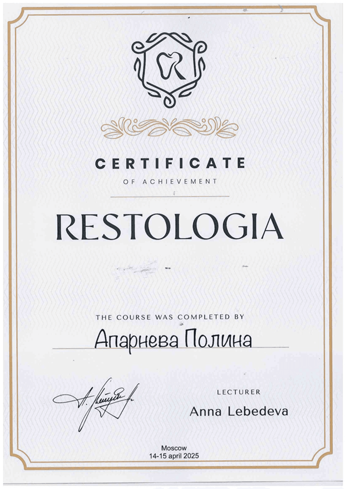 Апарнева Полина Викторовна – стоматолог-терапевт, чьи руки творят настоящие чудеса! С опытом работы, наполненным заботой о пациентах и стремлением к совершенству.